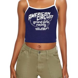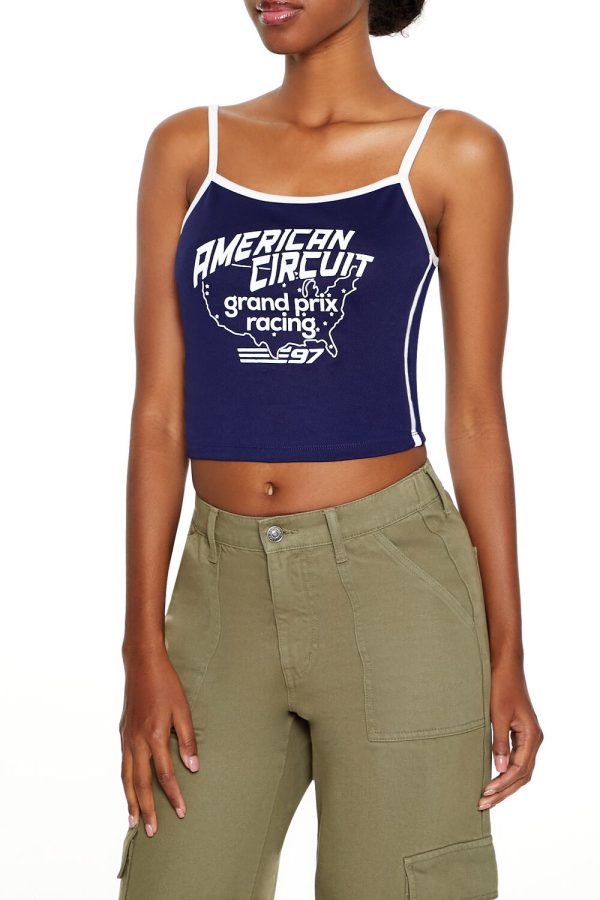 A knit cami featuring contrasting trim. adjustable straps. a straight-cut neckline and back. front ‘American Circuit’. ‘Grand Prix Racing’. and ’97’ text. and a cropped hem.