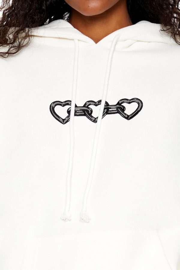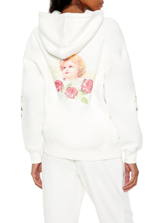 A fleece hoodie featuring ribbed trim. a drawstring hood. chest heart link chain graphic. kangaroo front pocket. dropped long sleeves. sleeve and back flower graphics. and back angel graphic.