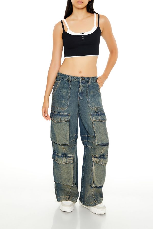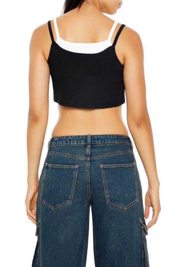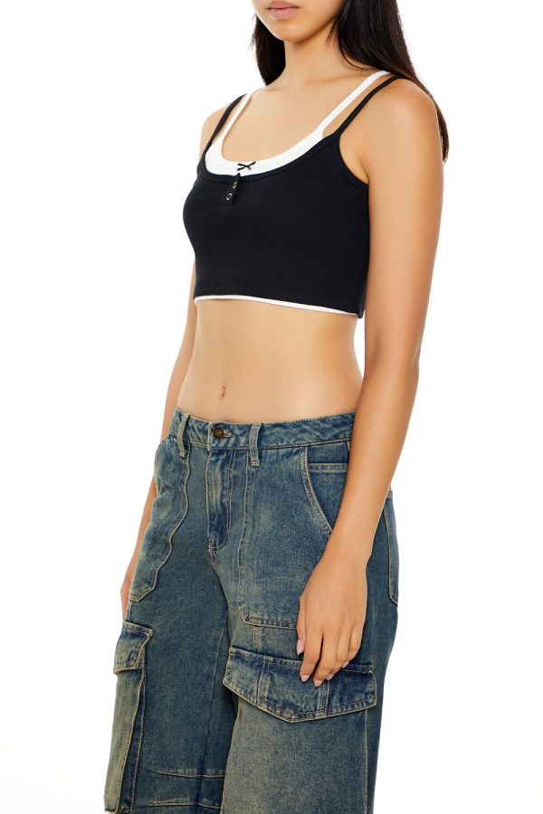 A knit combo cami featuring an allover ribbed construction. snap-button and bow chest embellishments. a cropped hem. straight-cut neckline and back. and fixed straps.