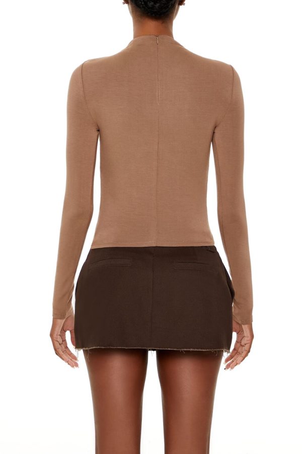 A knit top featuring a high neck. long sleeves. corset-inspired design. and a V-hem.
