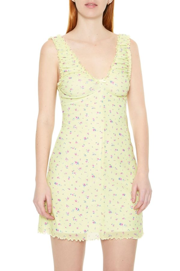 A mesh mini dress featuring an allover ditsy floral print. lettuce-edge trim. V-neckline and back. bow front embellishment. shoulder straps. concealed zippered back closure. and bodycon silhouette.