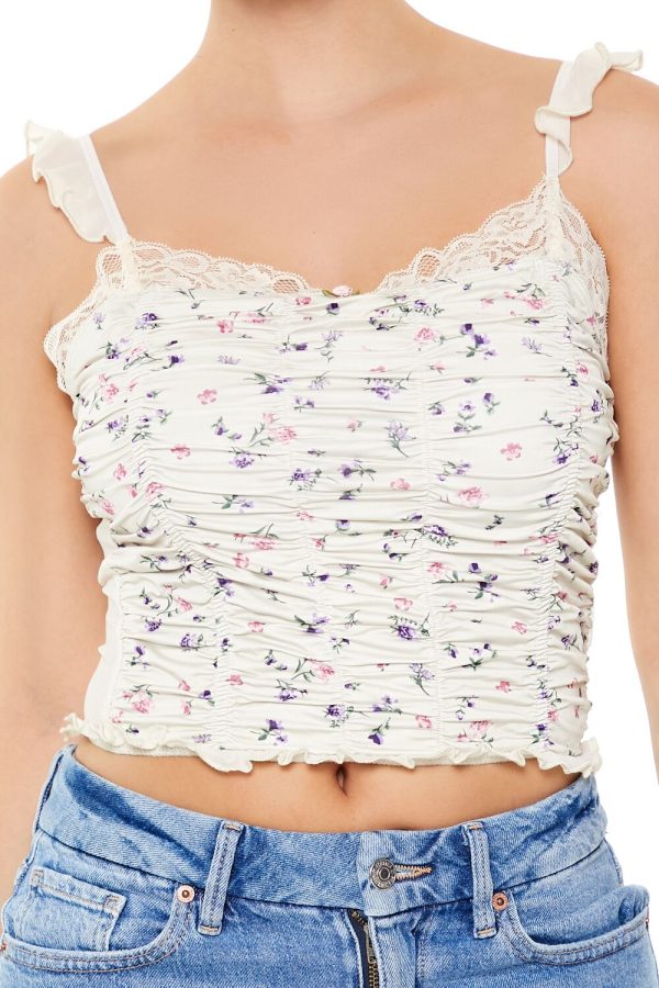 A jersey knit cami featuring a front floral print. ruched construction. ruffle and lace trim. straight-cut back with picot trim. adjustable straps. hook-and-eye back closures. and a cropped hem.