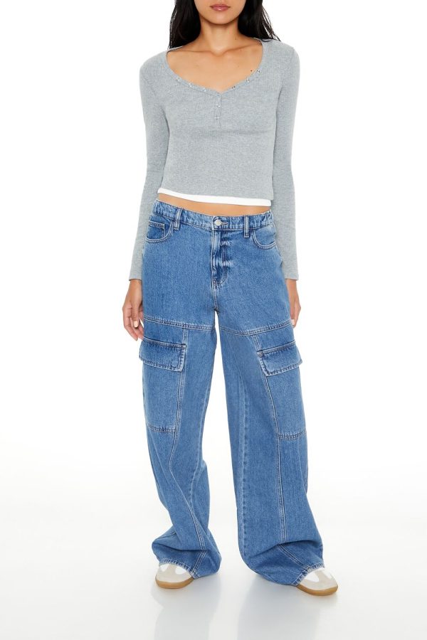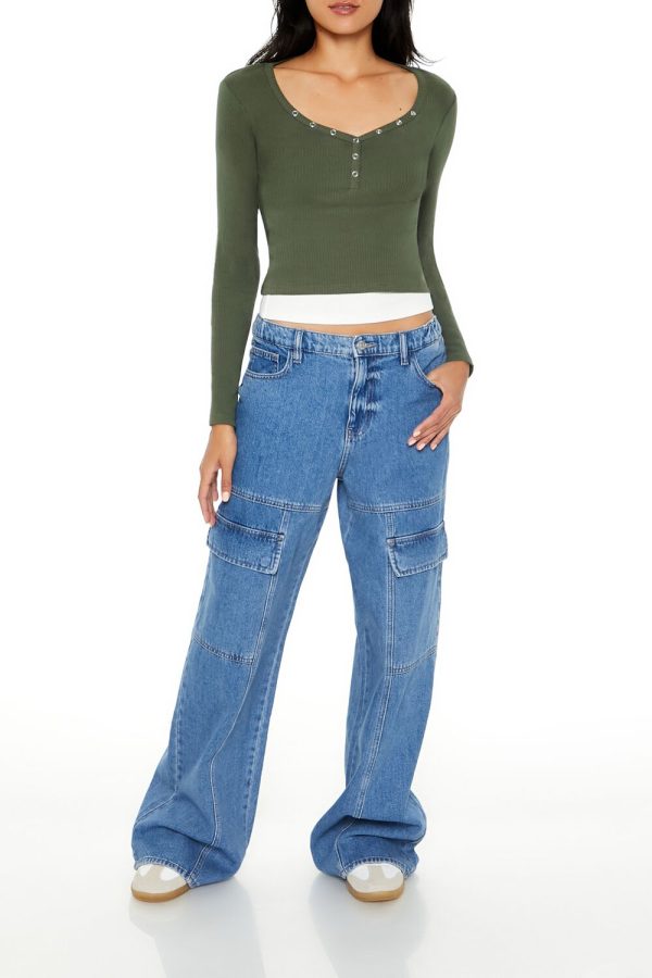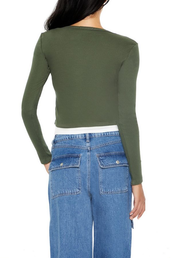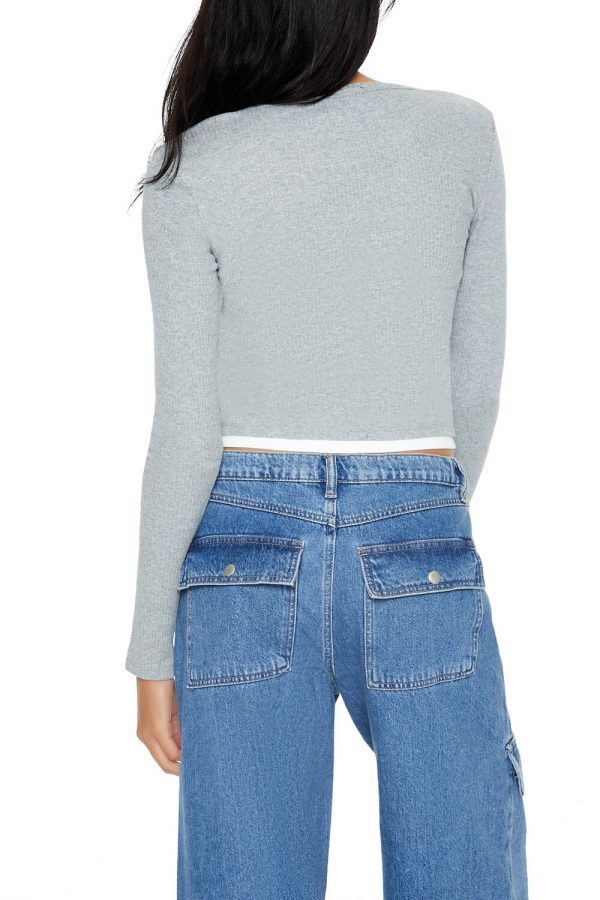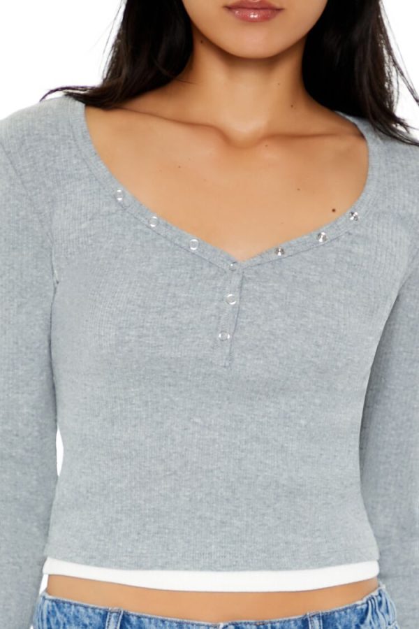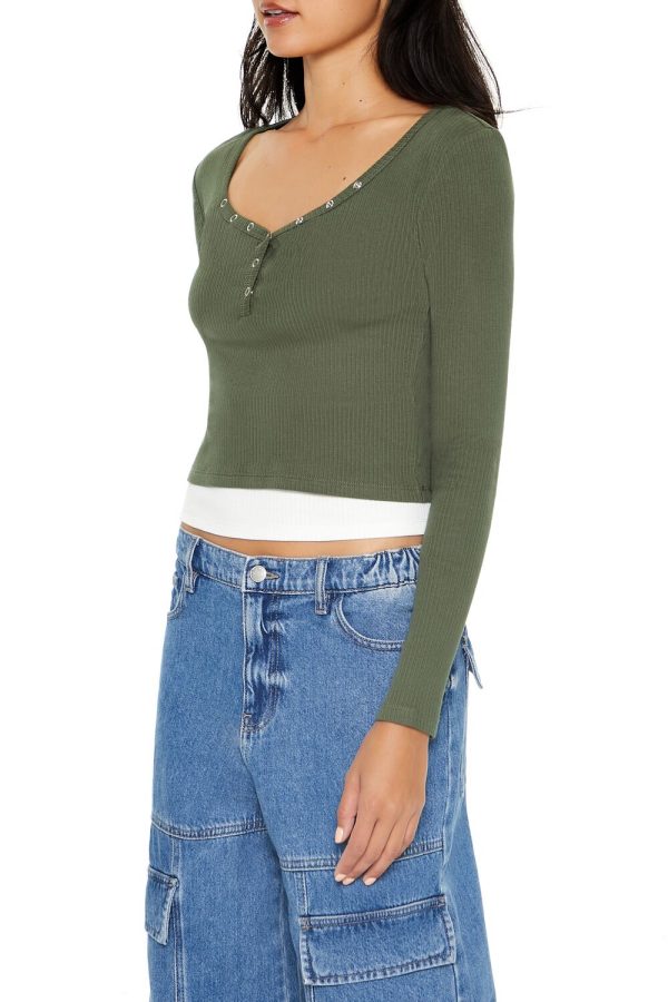 A ribbed knit combo Henley top featuring a snap-button partial placket. scoop neckline. long sleeves. and a cropped layered hem.