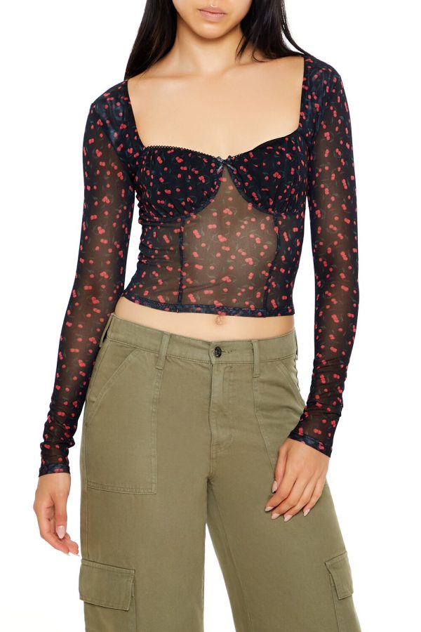 A mesh top featuring an allover cherry print. bustier-style bodice. sweetheart neckline. picot trim. bow chest embellishment. long sleeves. and a cropped hem.