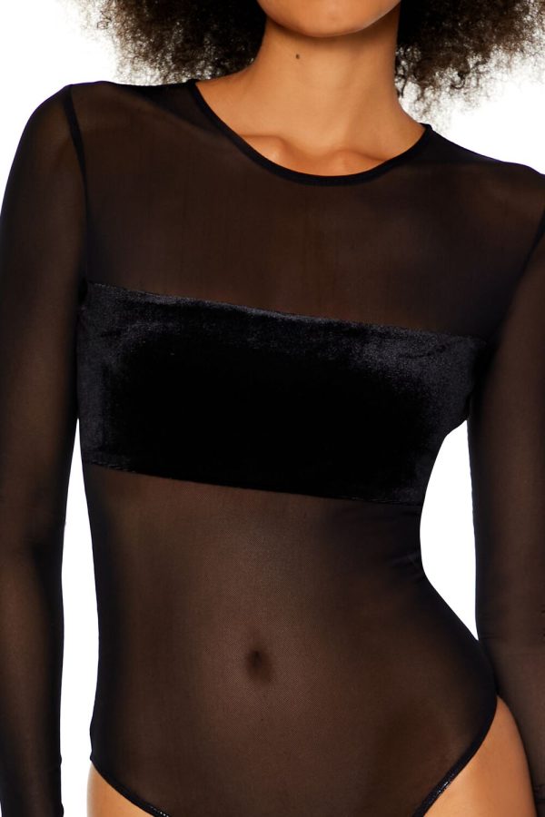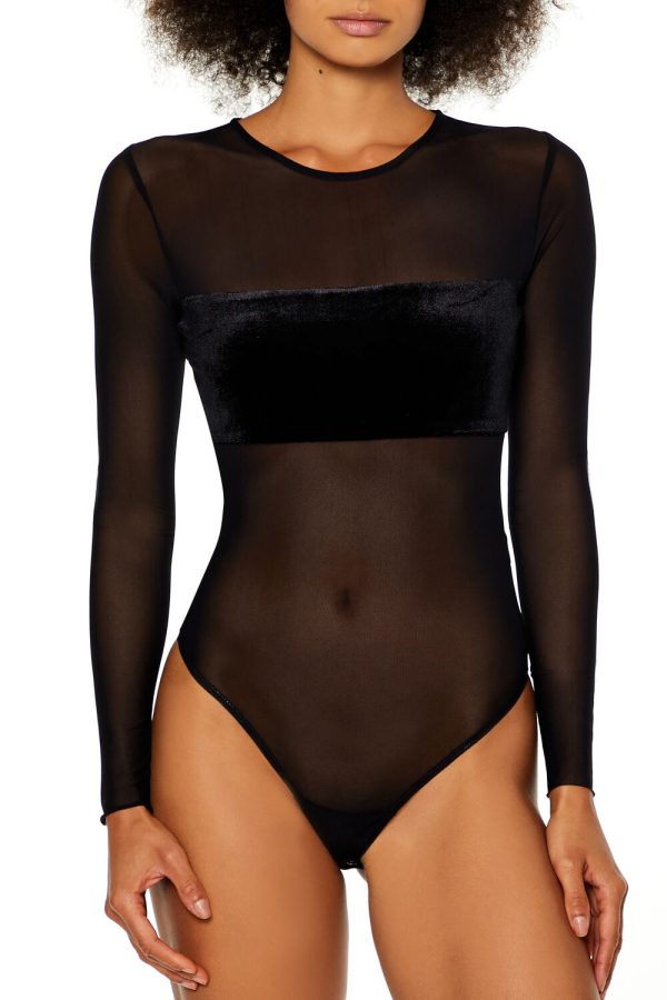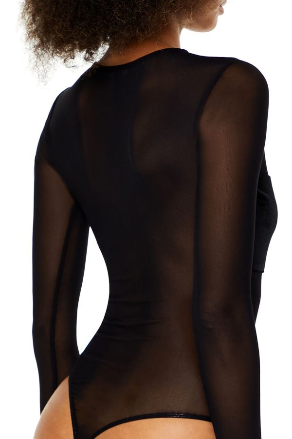 A sheer mesh knit bodysuit featuring a partial bust lining. round neckline. long sleeves. and a thong bottom cut.